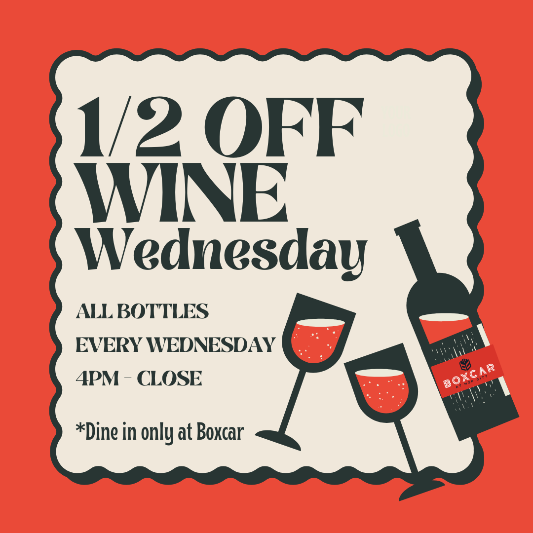 Get over your mid week blues with Boxcar! Join us on Wednesday for half off all bottles of wine.